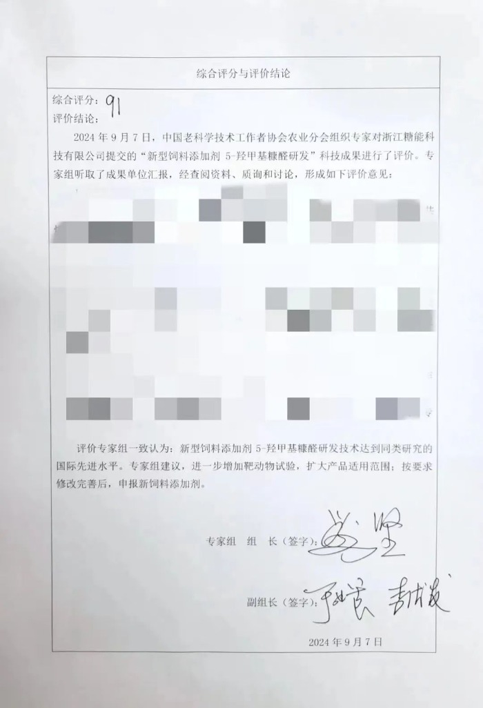 Evalueringsekspertgruppen var enige om at forsknings- og utviklingsteknologien til 5-hydroksymetylfurfural, et nytt fôrtilsetningsstoff, har nådd det internasjonale avanserte nivået for lignende forskning.